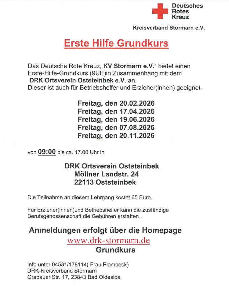 Erste Hilfe Kurse in 2026 beim Ortsverein der DRK- Oststeinbek